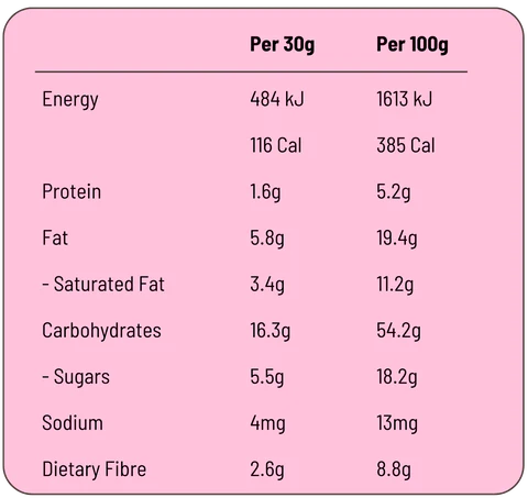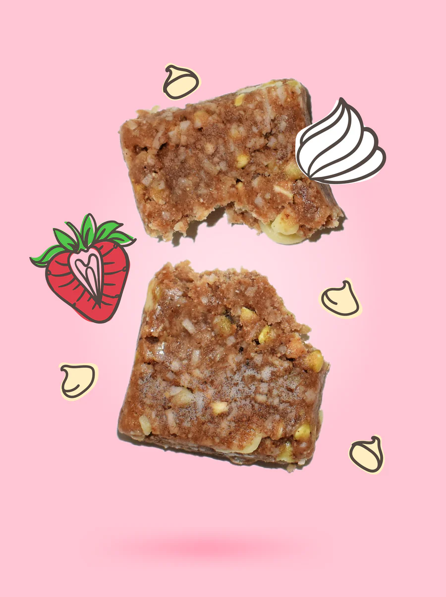 Ingredients for Strawberry Shortcake: Tigernuts, Buckwheat, Rice and Grape Concentrate, Organic Coconut, Organic Brown Rice Syrup, Organic Dried Strawberries (5.6%), Vegan White Chocolate, Organic Vanilla Extract
